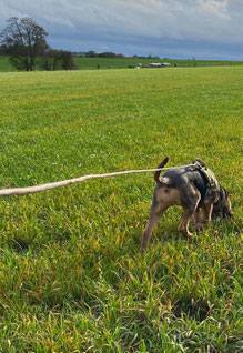 Elle pratique et se forme également au mantrailing auprès de différents instructeurs dont Patrick D’Artois au côté de qui elle est en formation continue depuis 5 ans.